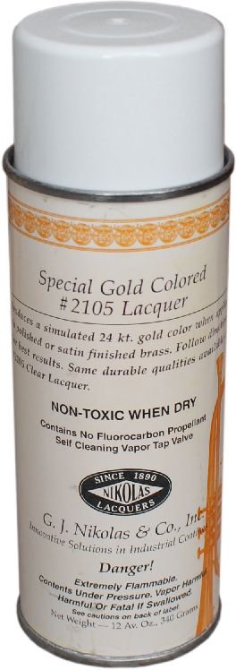 NIKOLAS jest amerykańskim producentem jednych z najlepszych nas świecie lakierów przeznaczonych do lakierowania dętych instrumentów muzycznych nowych jak również odnawianych. Daje bardzo trwałe powłoki w kolorze jak najbardziej zbliżonym do 24- karatowego złota. Lakier jest całkowicie nietoksyczne przy kontakcie z wodą. Idealnie pokrywa podłoża wykonane z mosiądzu, srebra, brązu oraz miedzi. Opakowanie w formie aerozolu pozwala na punktową renowację miejsc uszkodzonych, wytartych lub zarysowanych. Waga netto lakieru to 340g pozwala na kompletne odnowienie kilku instrumentów.